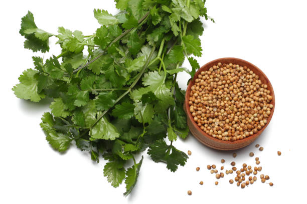 Fresh green koriandri leaves and dried seeds displayed in wooden bowl with natural lighting and rustic kitchen background